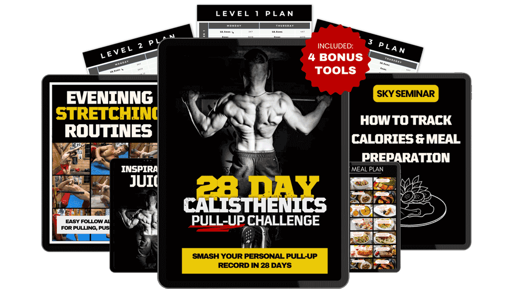 The 28-Day Calisthenics Pull-Up Challenge is a step-by-step system designed to help you double your pull-up personal record or get your 1st one in just 28 days.