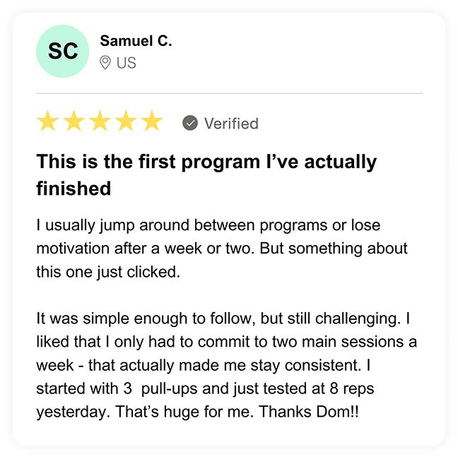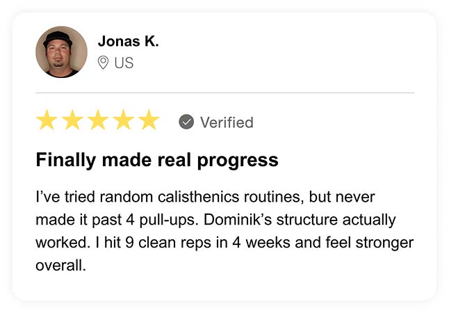 This guided challenge takes just 2 sessions per week, requires minimal equipment, and walks you through the exact progression Dominik used himself, so you can stop guessing and start getting stronger every day.
