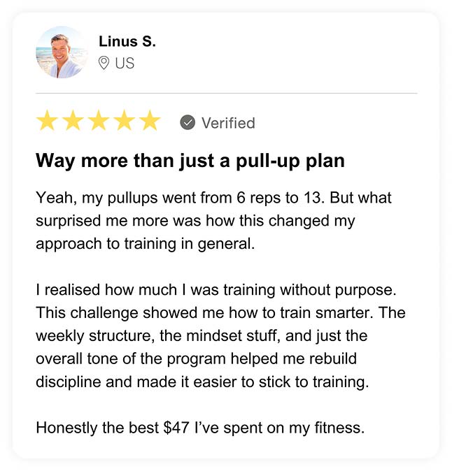 I’ve taken my best insights, cut the B.S., and built the exact system that consistently helps guys like you double their pull-ups — no matter where you start.