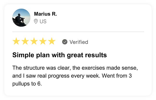 You’ll train pull-ups twice a week, and each session takes around 30-40 minutes. Focused. Efficient. No BS. The rest of the week is built around recovery, which is half of the success.