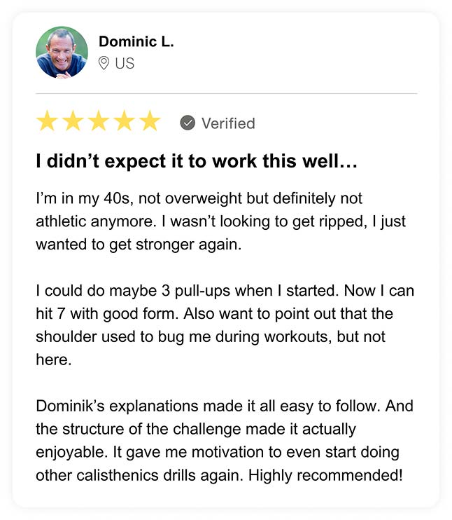 Created by Dominik Sky, a world-renowned calisthenics expert who helped 47,300 people increase their pull-up record in the last 15 years.